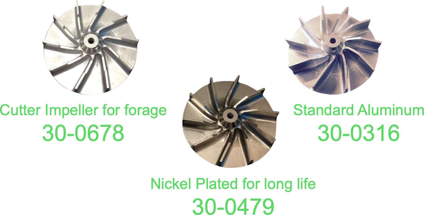 Cyclone Mill for Forages - Same as the popular Grain Mill - 3010-030 except that this mill is fit with a 'Forage Cover (30-0367)' for particularly leafy or stem forage and a ' Cutter Impeller' shown above.