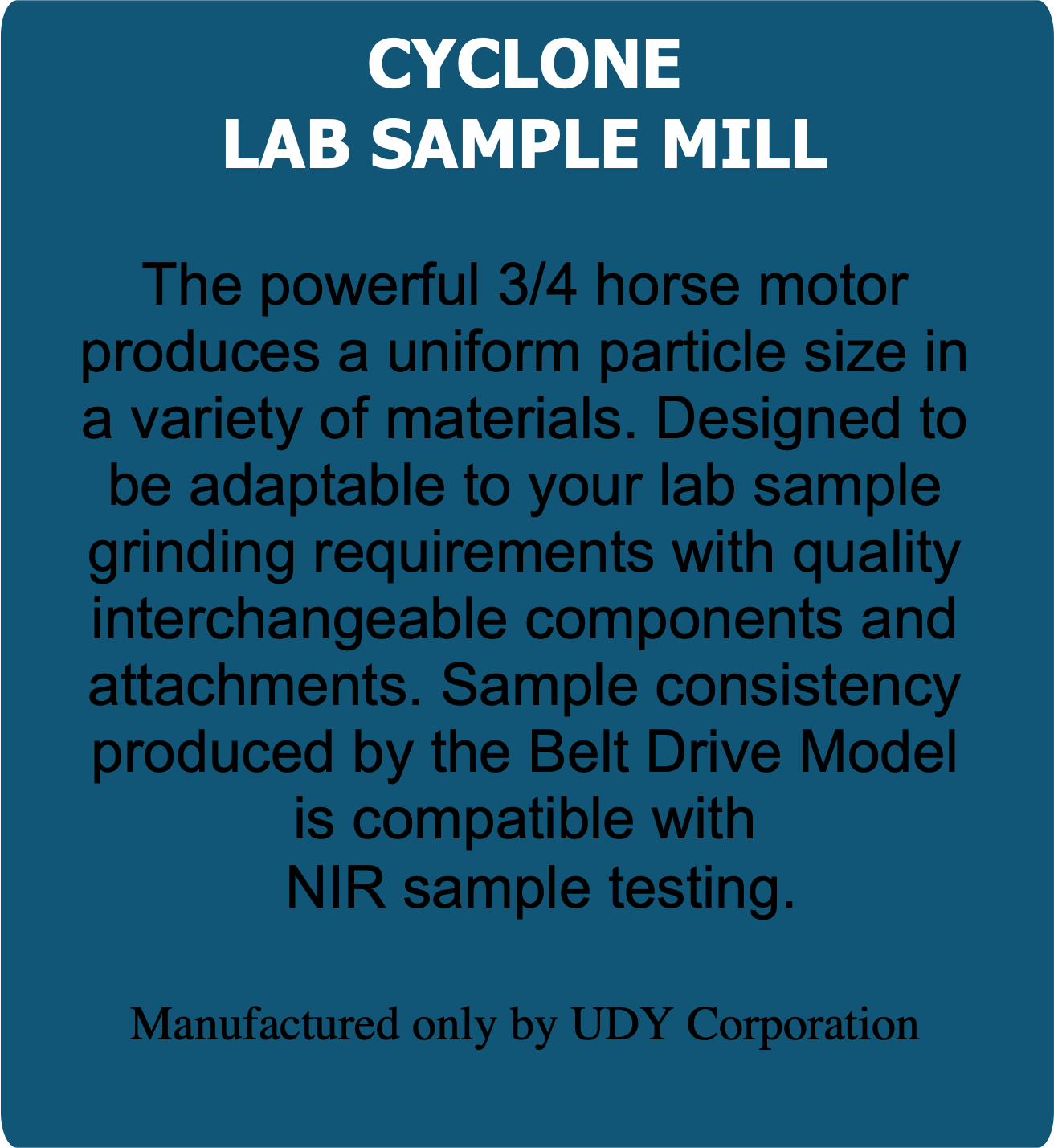 The UDY Direct Drive Cyclone Sample Mill is powered by a 1/2 hp AC/DC universal 115V 10,000 rpm full load (16,000 rpm no load) *U.S. Patent No. 3,754,715 and several foreign patents. This Direct Drive Mill (no belts) is a general work horse for your lab. (Impeller speed is sample feed rate dependent, particle size may vary.) - Not For NIR testing.